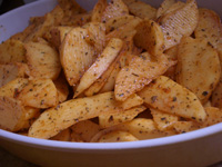 Directions:Step 1 Cut the potatoes into wedge pieces. Place them in a deep, round bowl with the oil. Toss on the spices. You may want to vary the amount of spice to your taste. Sometimes we have also put on a salad spice mix. The paprika makes the potatoes look as good as they taste. Mix the potatoes, oil, and spices so the potatoes are covered thoroughly and evenly.