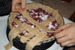 Step 2 Optionally put pie straps or a pie crust on top of the cherries. To create straps. Cut strips of rolled out pie dough. Place the vertical straps half way across the pie, then fold back half of them and place the horizontal straps, alternating the strips that you fold back. Repeat for the remaining vertical straps.
