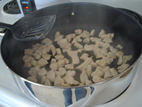 Step 2 Chop chicken into 1 cm cube pieces. Fry chicken with the oil in a frying pan until brown. Set aside.